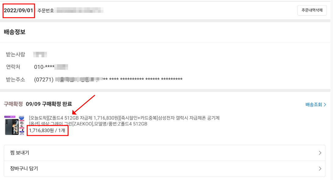 저의 구매내역을 보시면 정확히 사전예약이 종료되고 한 달 뒤인 시점에 갤럭시폴드 4 512GB를 1,716,830에 구매하였습니다