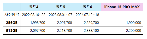 즉 폴드 4와 폴드 5는 동일한 512gb를 190만 원 초중반대에 살 수 있었던 것에 비해