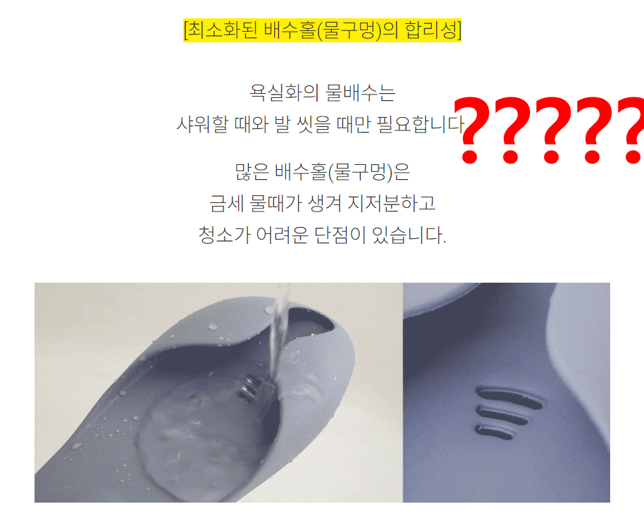 최소화된 배수홀로 인해 원 안으로 물이 슬리퍼 안에 고입니다