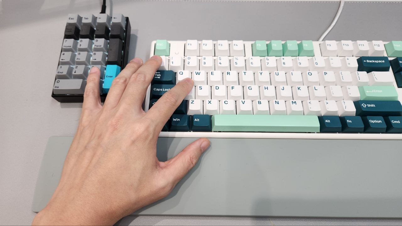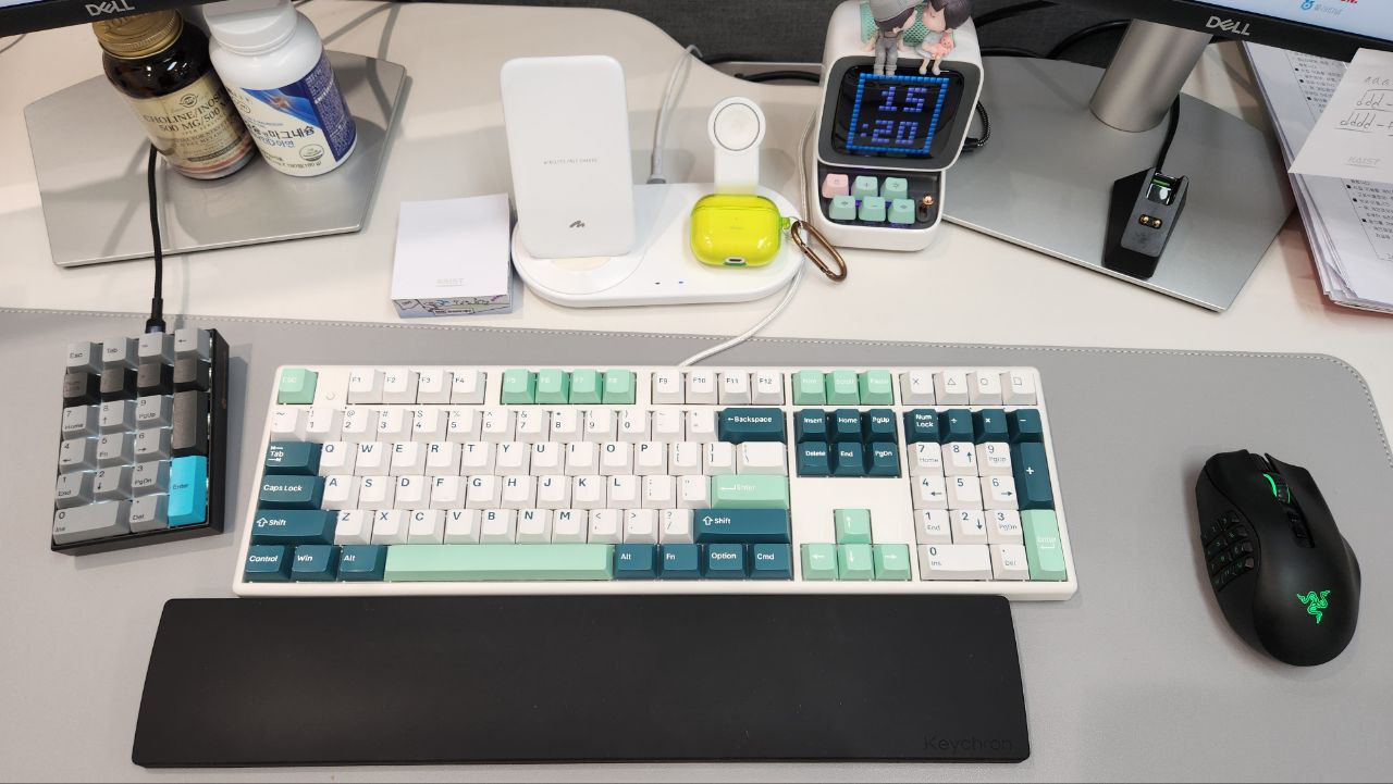 저는 회사에서 A4 용지를 보고 필기하면서 같이 작업을 하고 배달을 주로 시켜먹고 엎드려 자는 스타일(?)이라 키크론의 검정 실리콘 팜레스트를 가장 편하게 사용하고 있습니다